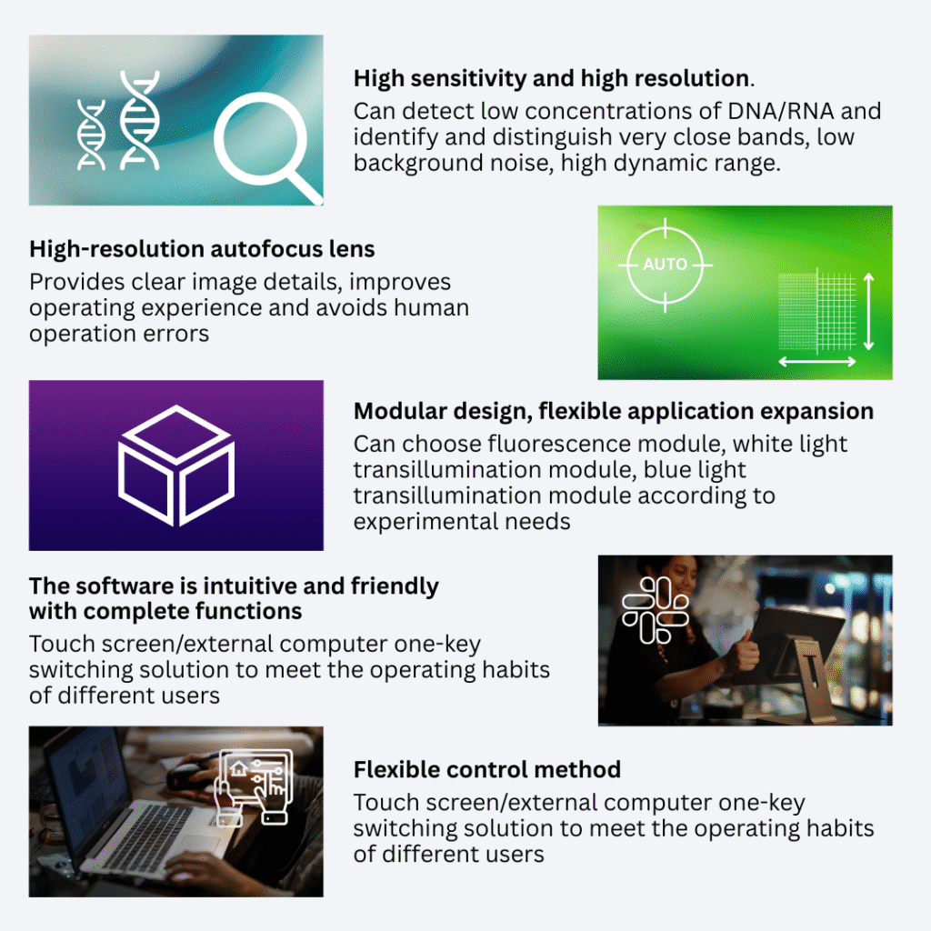 The gel imaging system is equipped with a fully automatic computer control system and high-resolution, high-sensitivity imaging components to ensure clear capture of images such as DNA/RNA electrophoresis gel, protein electrophoresis gel, and spot hybridization under low illumination without fear of band loss. Combined with powerful professional gel image analysis software, it helps molecular biology and clinical researchers to efficiently obtain accurate electrophoresis result images and analysis data.